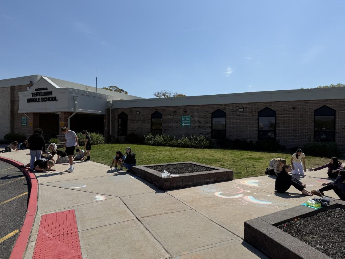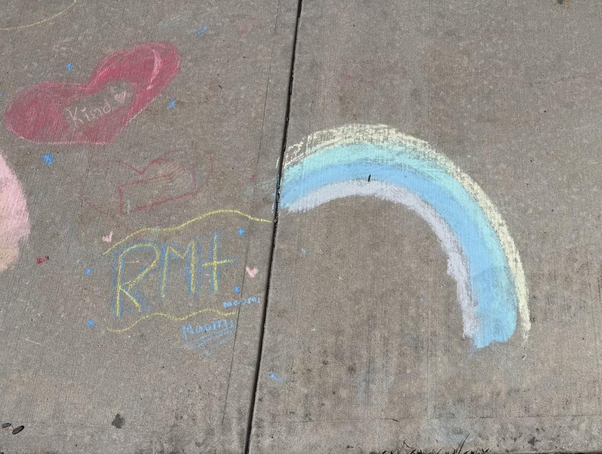 7th grade science has been studying the electromagnetic spectrum. Today we investigated how a prism works. Working with their lab partners, students manipulated the position of their prism to find the correct angle of the sun to bend light so they could see the different wavelengths of color. Using sidewalk chalk, students recorded the different wavelengths by coloring the colors of the rainbow. We then added some positive comments to brighten the day of students and staff as they left on a sunny Friday afternoon.