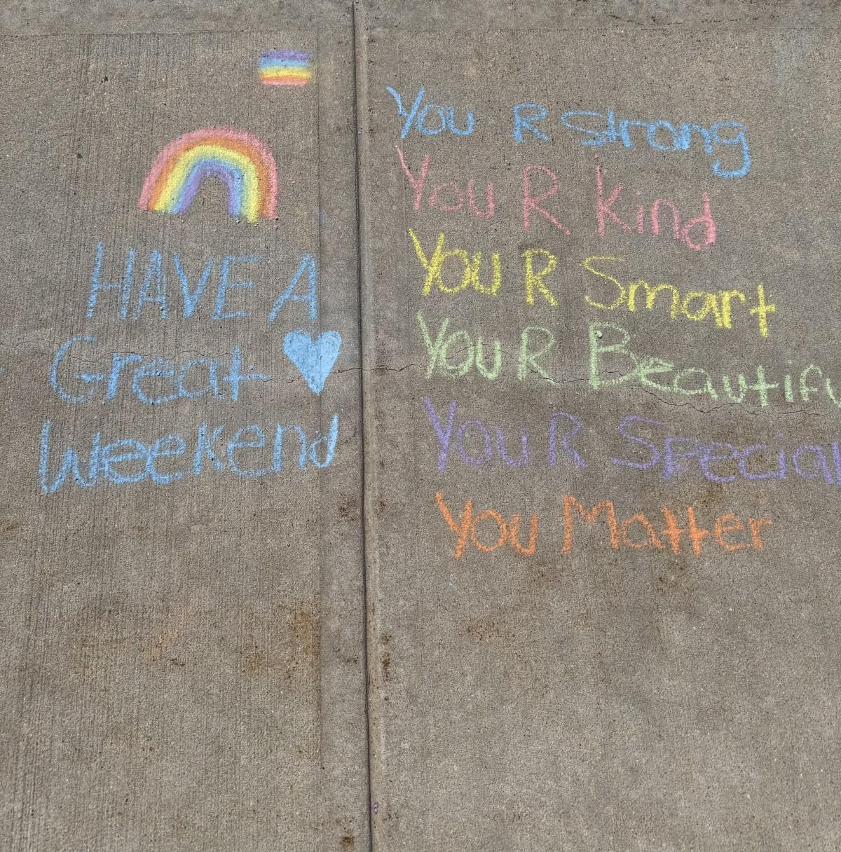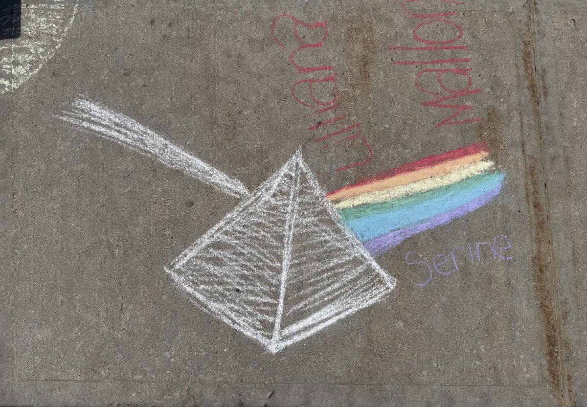 7th grade science has been studying the electromagnetic spectrum. Today we investigated how a prism works. Working with their lab partners, students manipulated the position of their prism to find the correct angle of the sun to bend light so they could see the different wavelengths of color. Using sidewalk chalk, students recorded the different wavelengths by coloring the colors of the rainbow. We then added some positive comments to brighten the day of students and staff as they left on a sunny Friday afternoon.